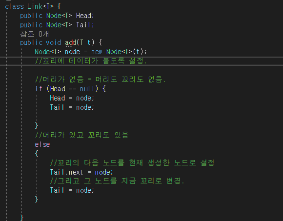 그리고, 추가 기능을 구현하자면 데이터를 받고 그 데이터를 가진 노드를 생성한다. 그리고 그 노드를 끝(꼬리)로 설정한다.