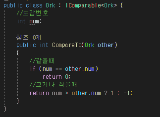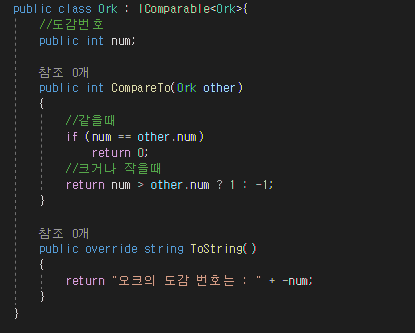 그래서 이제 나는 Ork라는 클래스를 우선순위 큐에 넣고 싶은데 도감 번호로 우선순위를 설정하기 위해서 IComparable을 상속받고 거기에 같을때 0, 클때 1, 작을때 -1을 리턴하도록 설정