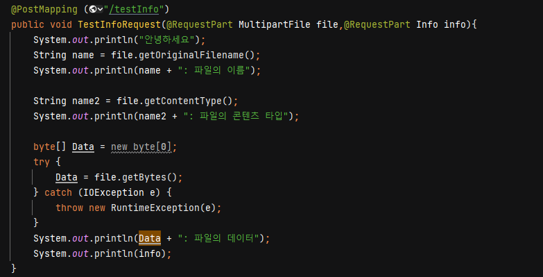 이렇게 하나는 파일로, 하나는 json으로 보낸다. 이게 멀티파트의 장점이랄까?