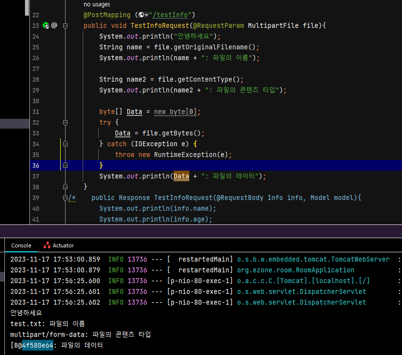 이렇게 하나는 파일로, 하나는 json으로 보낸다. 이게 멀티파트의 장점이랄까?