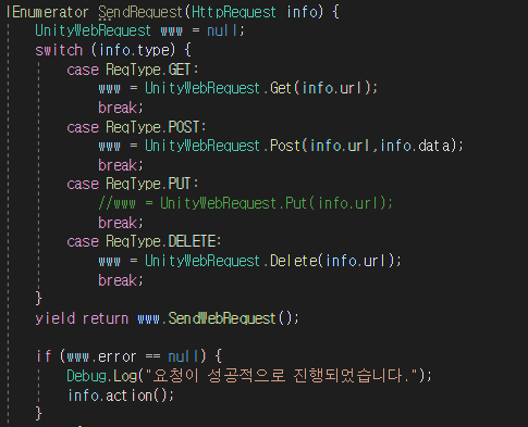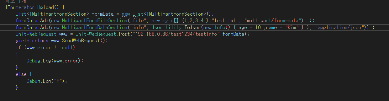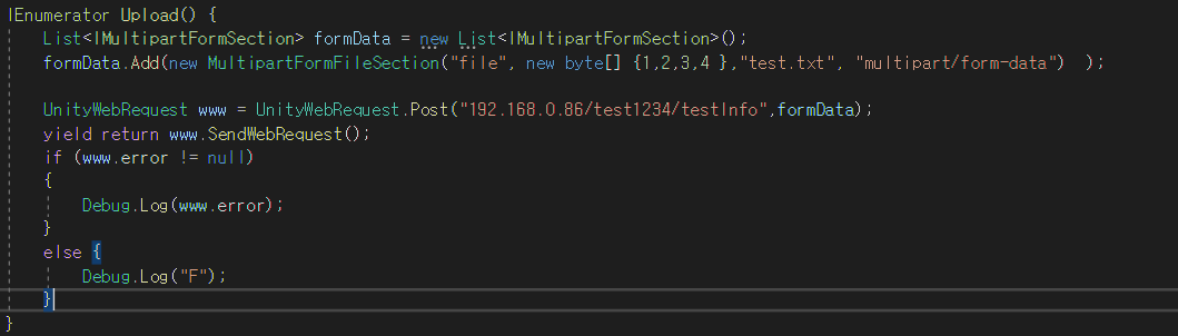 유니티 공식 사이트에는 IMultipartFormSection 인터페이스 리스트를 만들고, 'MultipartFormFileSection'으로 요청을 하고 있었다. 첫번째 인수로는 서버에서 받는 이름, 두 번째 인수로는 바이트 데이터 세 번째 인수로는 파일 이름 마지막은 콘텐츠 타입. 일단 테스트로 요청을 한번 보내보자.
