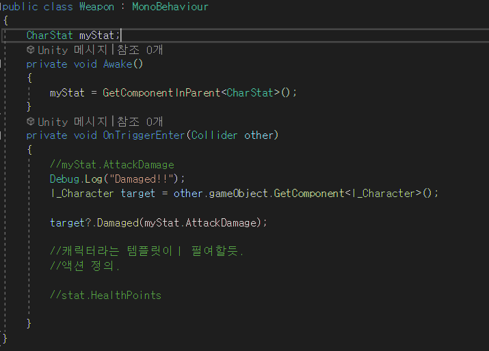 Weapon이라는 클래스도 만들었는데, 무기에 맞은 캐릭터에게 데미지를 주는 모습이다.