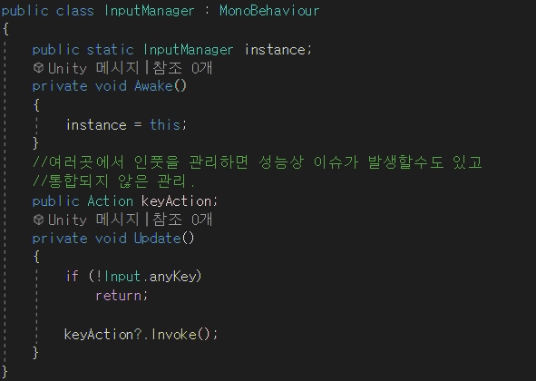 이렇게 예시를 드니 와닿는다. 자 그러면 이제 이것을 InputManager를 이용해 개선해본다면, KeyAction을 이용해야할것!