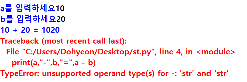 입력을 한 결과 오류가 발생하였다.. 왜냐하면 입력은 바로 문자를 입력받기 때문이다. 문자를 뺄 수 있는가? 문자를 나눌수 있는가? 문자로 사칙연산은 불가능하다. 그렇기 때문에 타입 변환을 해주어야 한다.