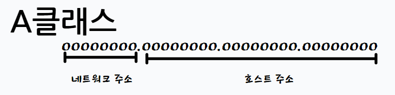A클래스는 왼쪽 맨 첫번째 비트를 네트워크 주소, 그외 옥텟은 호스트 주소로 사용하는것이다.